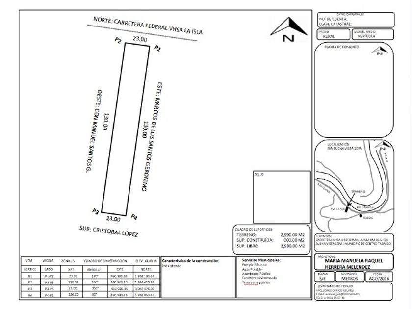 Venta de terreno en villahermosa Superficie 2,990 m2 Precio por m2: $668.89 Precio por lote: $2,000,000 Usos de suelo: preservacio?n ecolo?gica, zona de amortiguamiento ante anegaciones, con vocacio?n agropecuario. Vias de acceso: carretera a buena vista "la isla", vialidad de 2do orden con Mediano tra?fico vehicular, km. 16+500 Servicios publicos y equipamiento urbano: en un radio de 1000 m. Abastecimiento de agua potable, de la red municip...