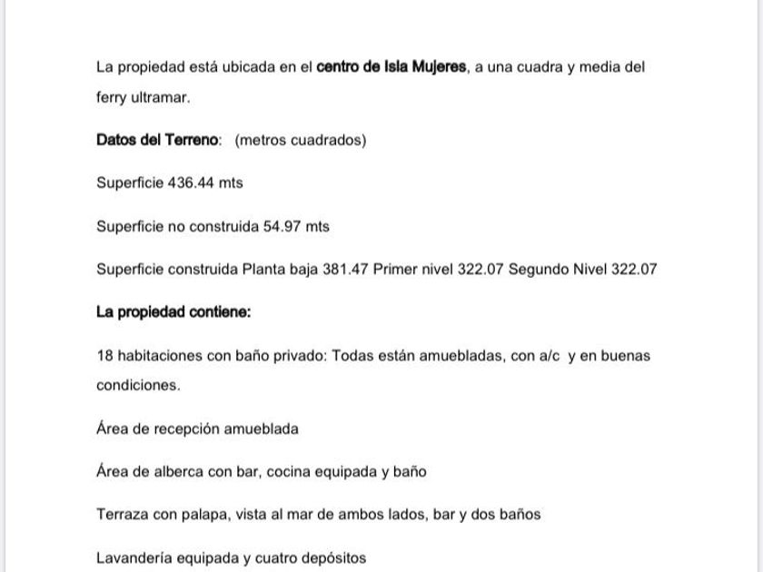 A solo 100 metros del mar se encuentra el UNICO HOTEL EN VENTA actualmente en Isla Mujeres. con 18 habitaciones recien remodeladas, alberca, bar y roof top con vista al mar caribe, esta propiedad es una imncreible oportunidad de inversion en uno de los puntos mas codiciados del caribe mexicano, la bellisima isla mujeres.