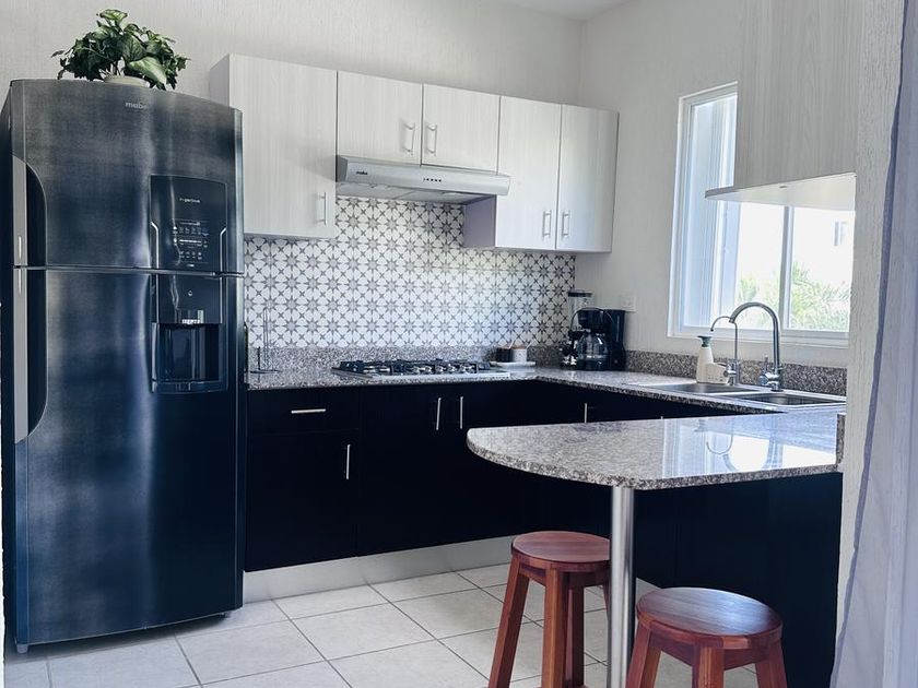 Este amplio y luminoso departamento cuenta con 3 recámaras, 2 baños completos y medio baño. Cuenta con cortinas anticiclónicas en todas las ventanas y un agradable balcón con vista a las áreas comunes.En el área común se tiene 1 alberca con terraza y baños . Además cuenta con un área central que conecta varias privadas con andadores y jardines.